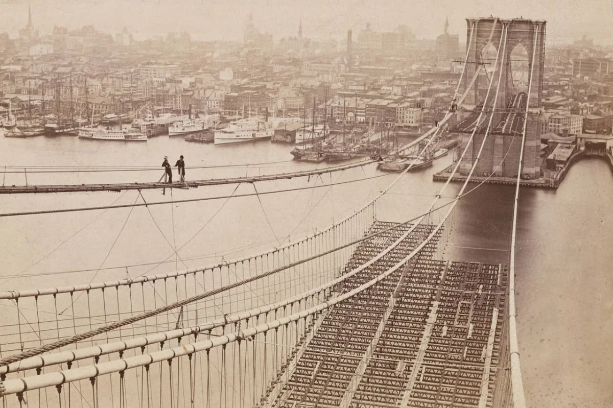 Brooklyn Bridge under construction, circa late 1870s. This image captures the perilous catwalk suspended above the East River, where engineers and laborers balanced between sky and steel. During this phase, Emily Warren Roebling served as the bridge’s critical liaison — conveying technical instructions, managing correspondence, and ensuring the project’s continuity while her husband, chief engineer Washington Roebling, remained bedridden. Her presence was not ceremonial; it was structural.