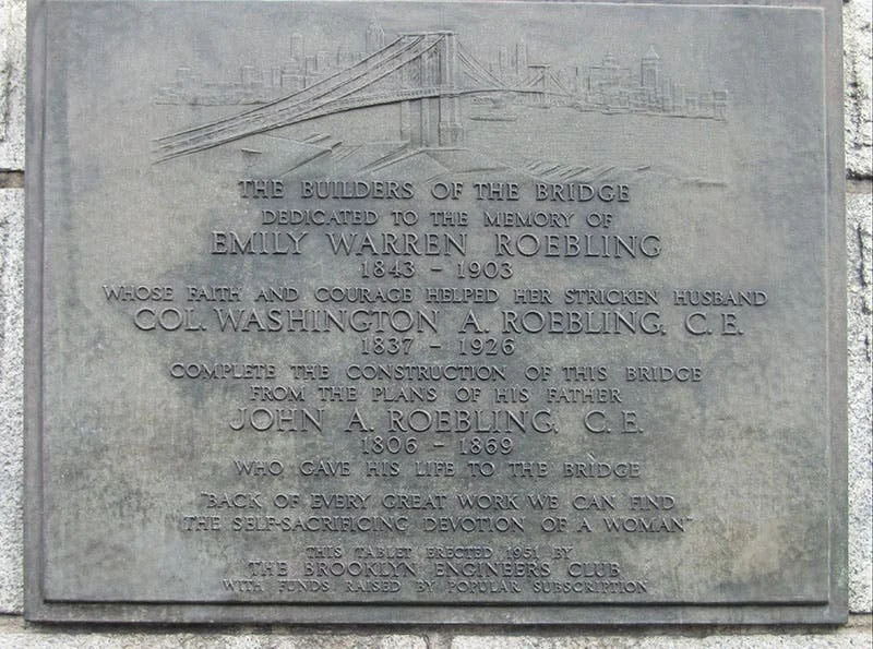 Commemorative plaque honoring the builders of the Brooklyn Bridge, installed in 1951 by the Brooklyn Engineers Club. At its center is the name of Emily Warren Roebling (1843–1903), whose technical command and unwavering resolve helped carry the bridge to completion after her husband, Washington Roebling, was incapacitated. The inscription recognizes her role not as symbolic, but structural — a testament to the unseen labor that held the bridge together. The quote etched below speaks to the broader truth her story embodies: “Back of every great work we can find the self-sacrificing devotion of a woman.”